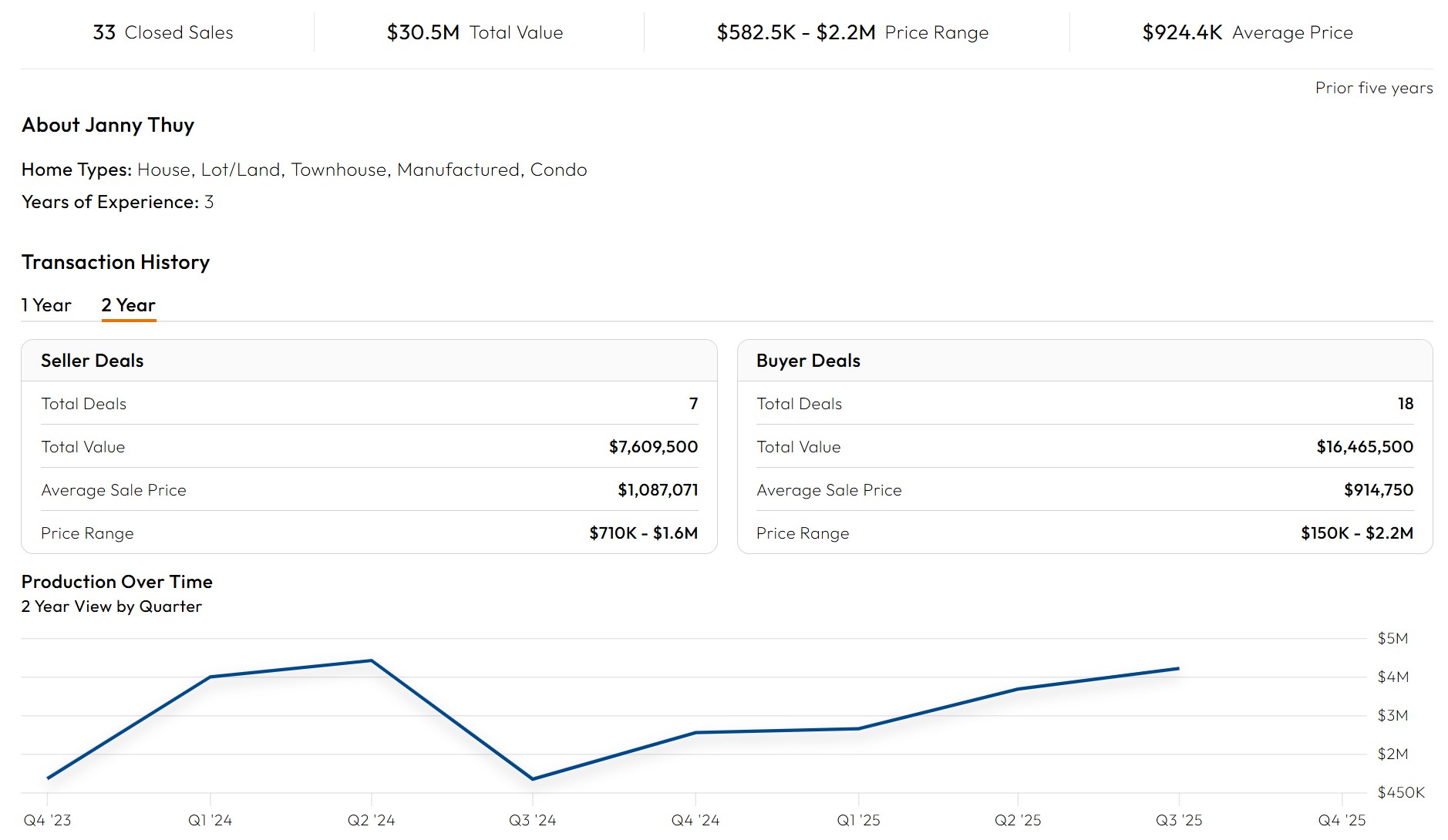 The best experience I have had with a realtor. Thuy is extremely professional and knowledgeable. She kept me informed throughout the entire process. She helped to find a financing person and purchased of a dream home all within two month time frame. Outstanding!!!!